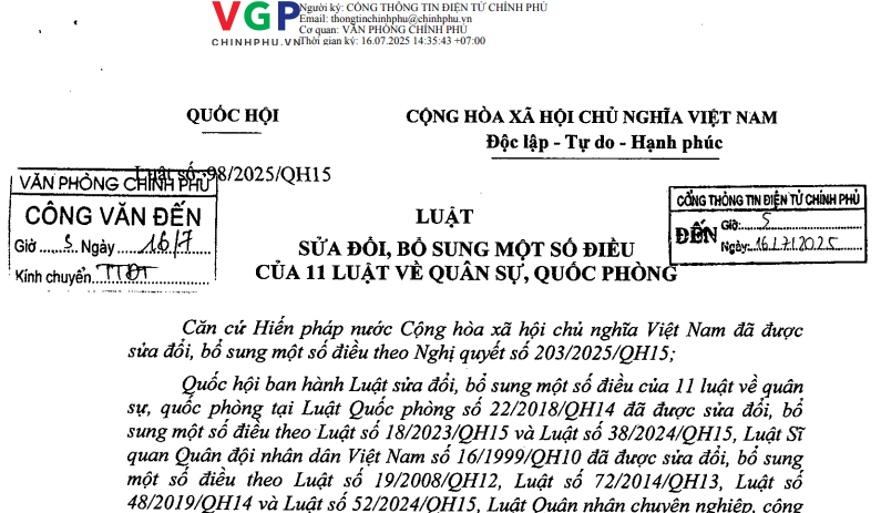 Số ký hiệu 98/2025/QH15 Ngày ban hành 27-06-2025 Ngày có hiệu lực 01-07-2025 Loại văn bản Luật Cơ quan ban hành Quốc hội Người ký Trần Thanh Mẫn Trích yếu Luật sửa đổi bổ sung một số điều của 11 luật về quân sự, quốc phòng Tài liệu đính kèm 98qh.signed.pdf