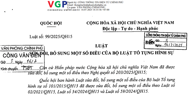 Luật số 99/2025/QH15 của Quốc hội: Sửa đổi, bổ sung một số điều của Bộ Luật Tố tụng hình sự Số ký hiệu 99/2025/QH15 Ngày ban hành 27-06-2025 Ngày có hiệu lực 01-07-2025 Loại văn bản Luật Cơ quan ban hành Quốc hội Người ký Trần Thanh Mẫn Trích yếu Sửa đổi, bổ sung một […]